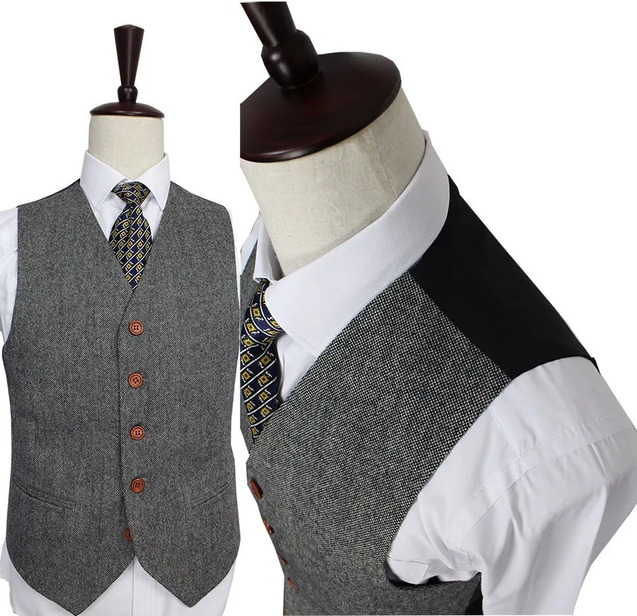 Retro gentleman style Grey Classic Tweed tailor wedding suits for men custom made Wool Slim Fit blazer mens 3 piece suit